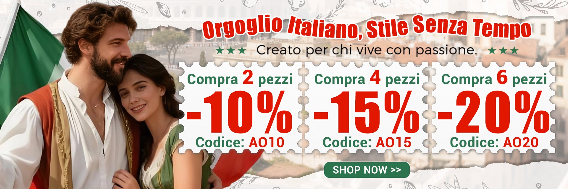 Grazie per averci scelto. Un piccolo dono ti aspetta: –10% su 2 capi (AO10) · –15% su 4 capi (AO15) · –20% su 6 capi (AO20)