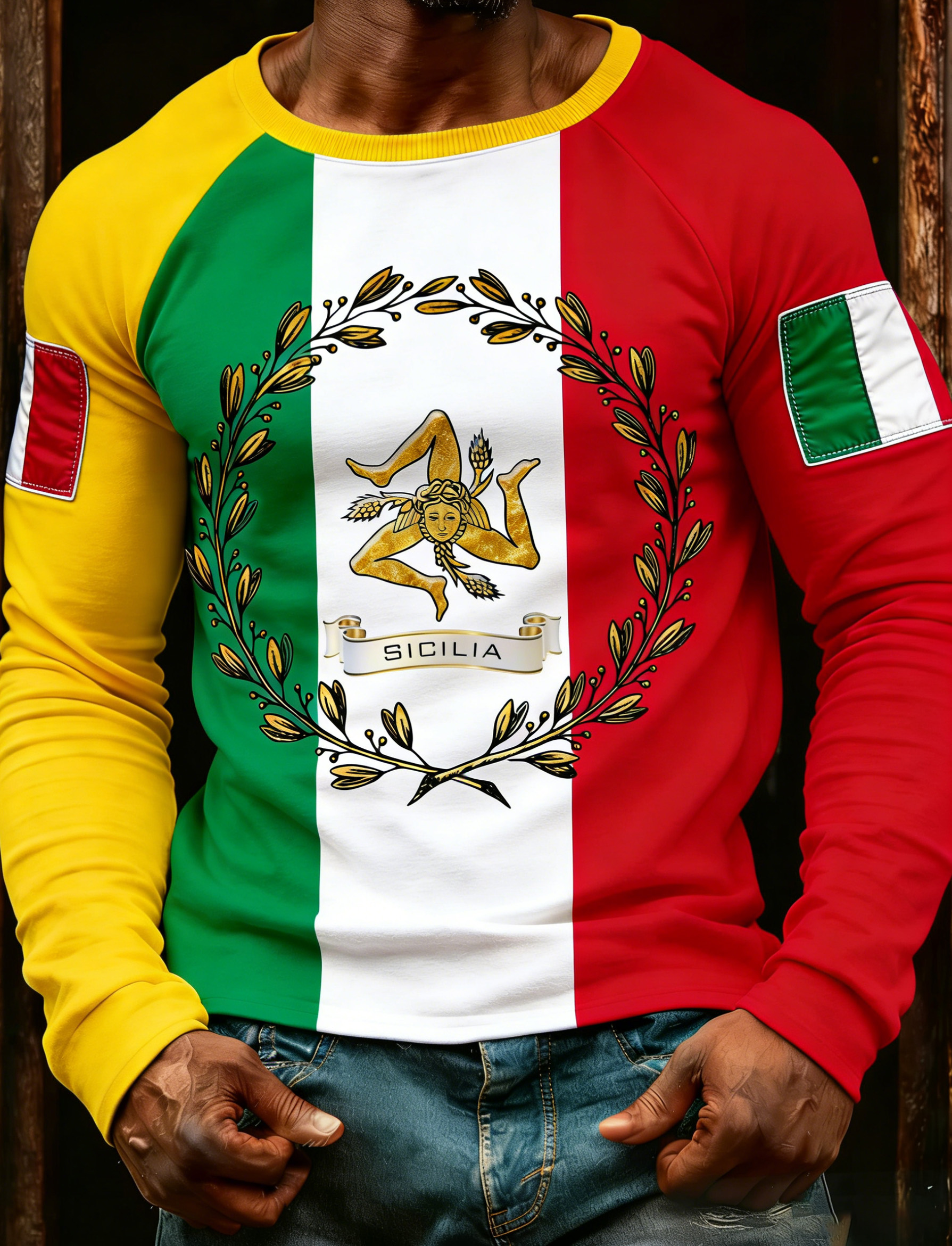 Maglietta da uomo con stampa artistica che riprende gli elementi della Trinacria siciliana