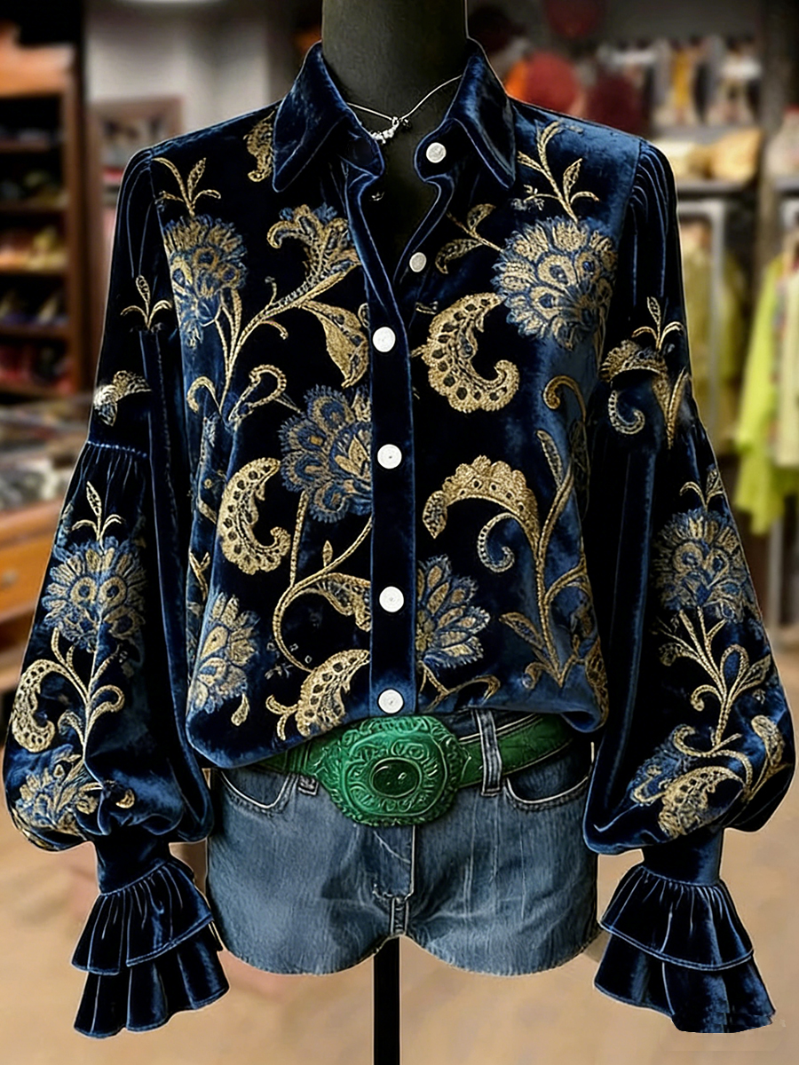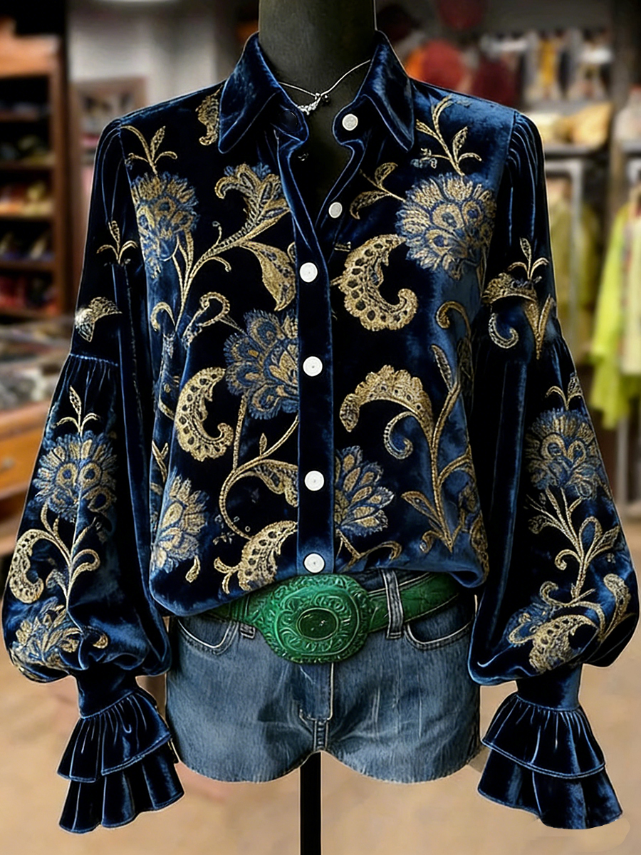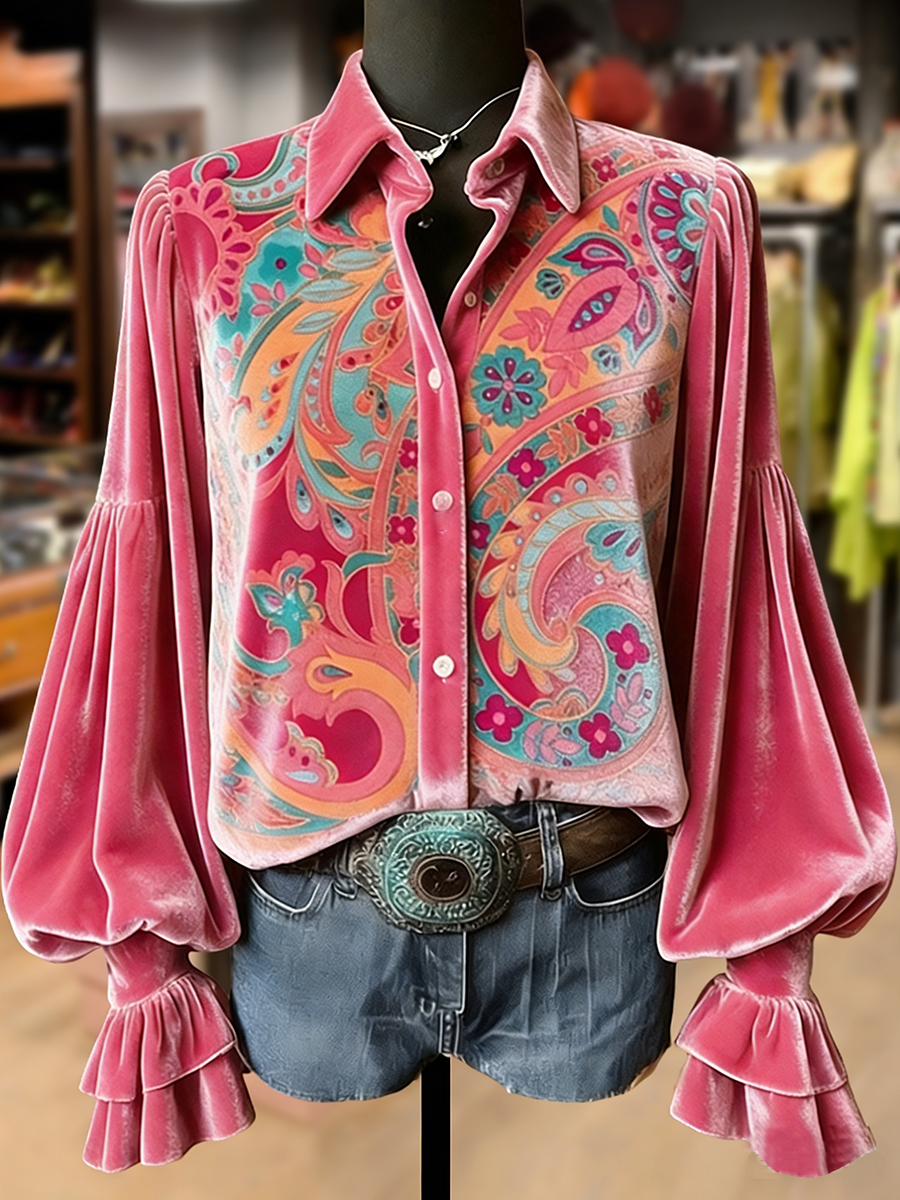 Top a manica lunga con stampa artistica a fiori retrò da donna