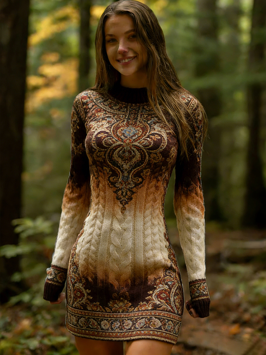 Abito comodo ed elegante da donna in stile etnico vintage con stampa floreale lavorato a maglia