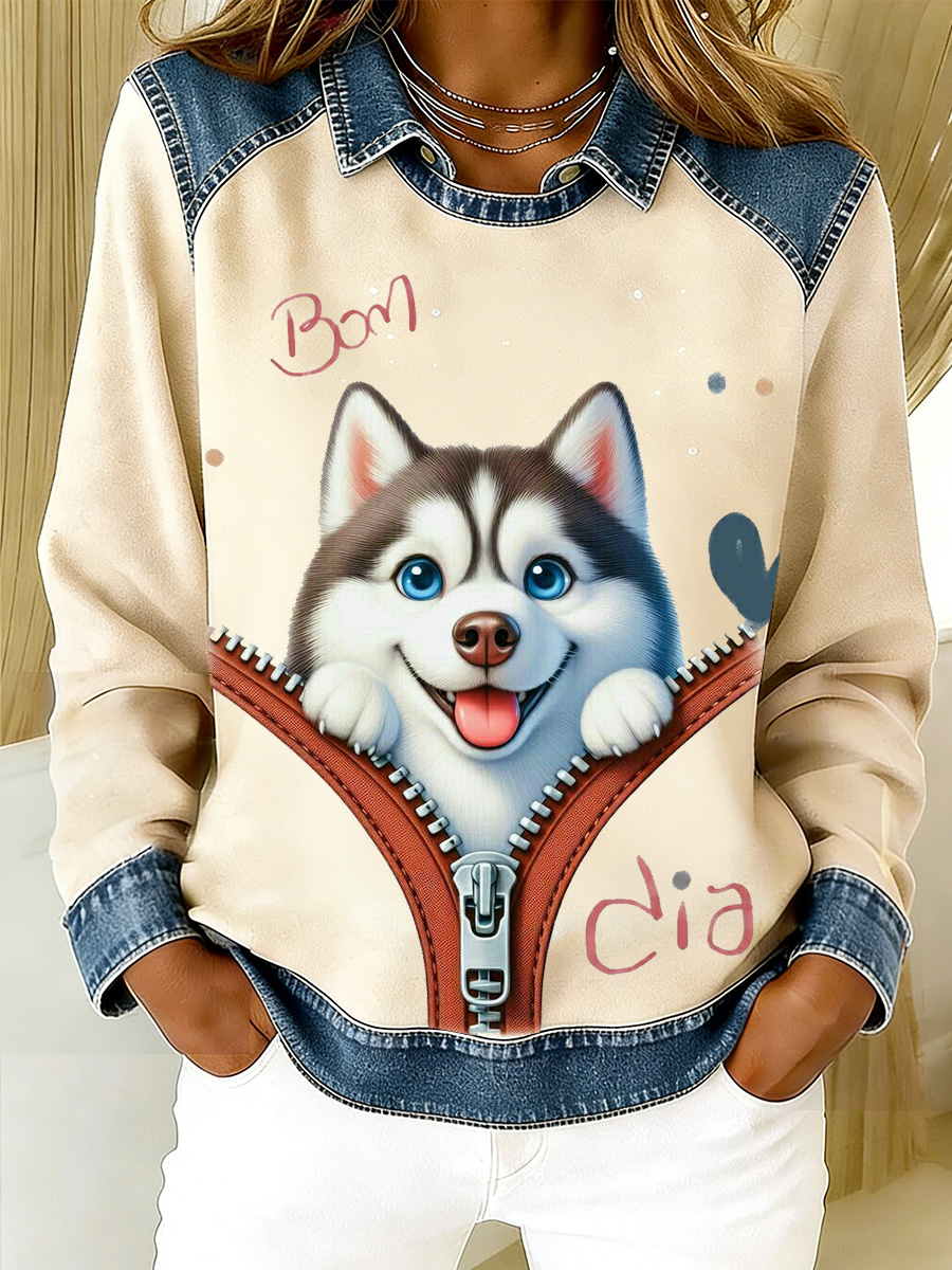 Felpa da donna con patchwork patchwork in denim con motivo a cane peloso da donna