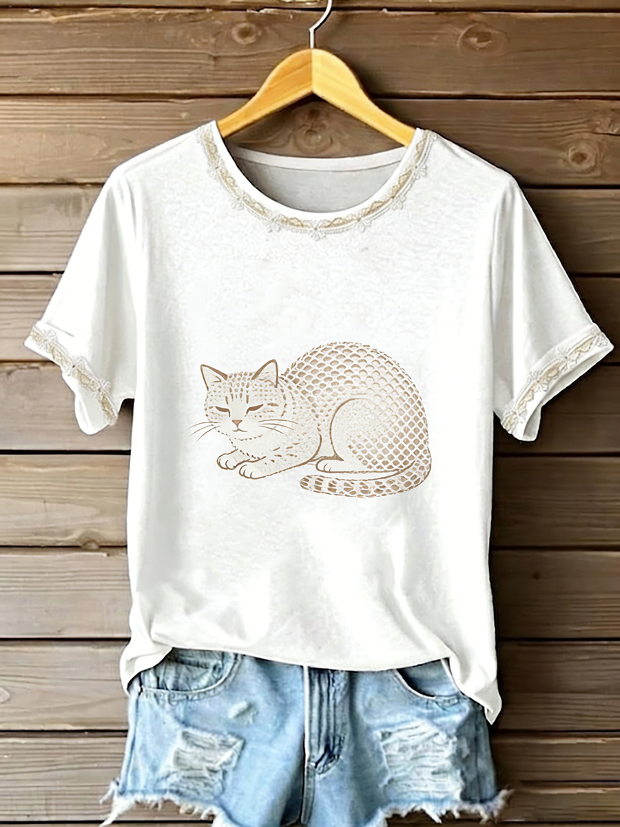 T-shirt da donna con gatto e arte a maniche corte