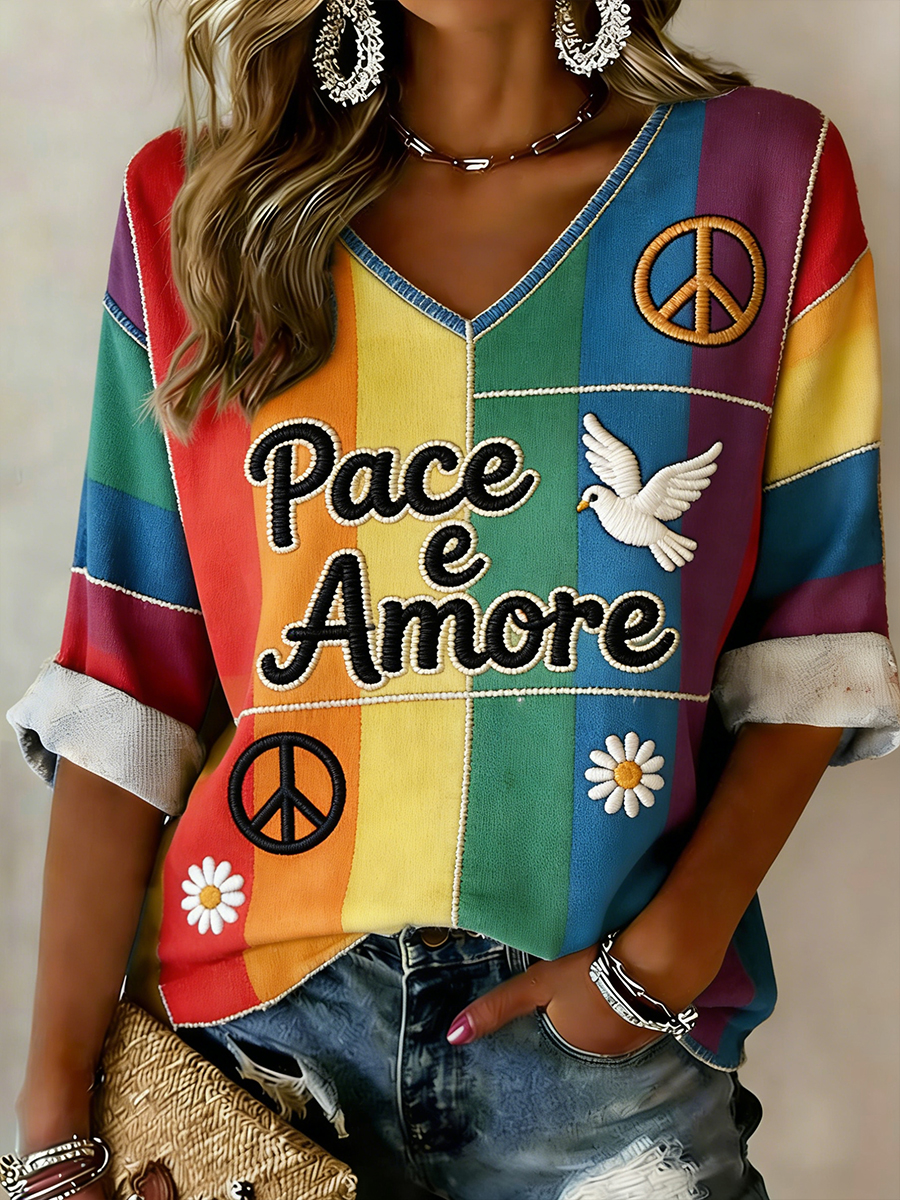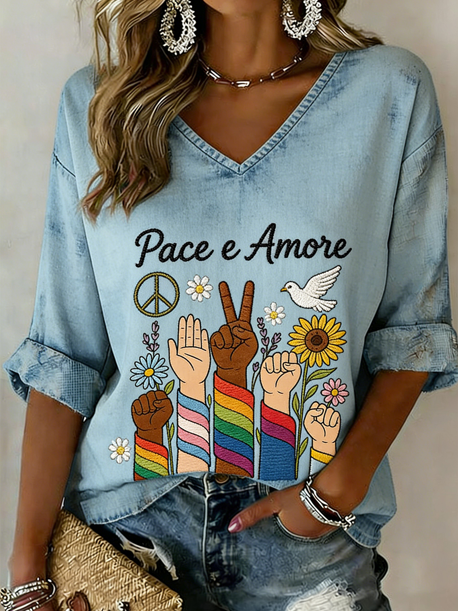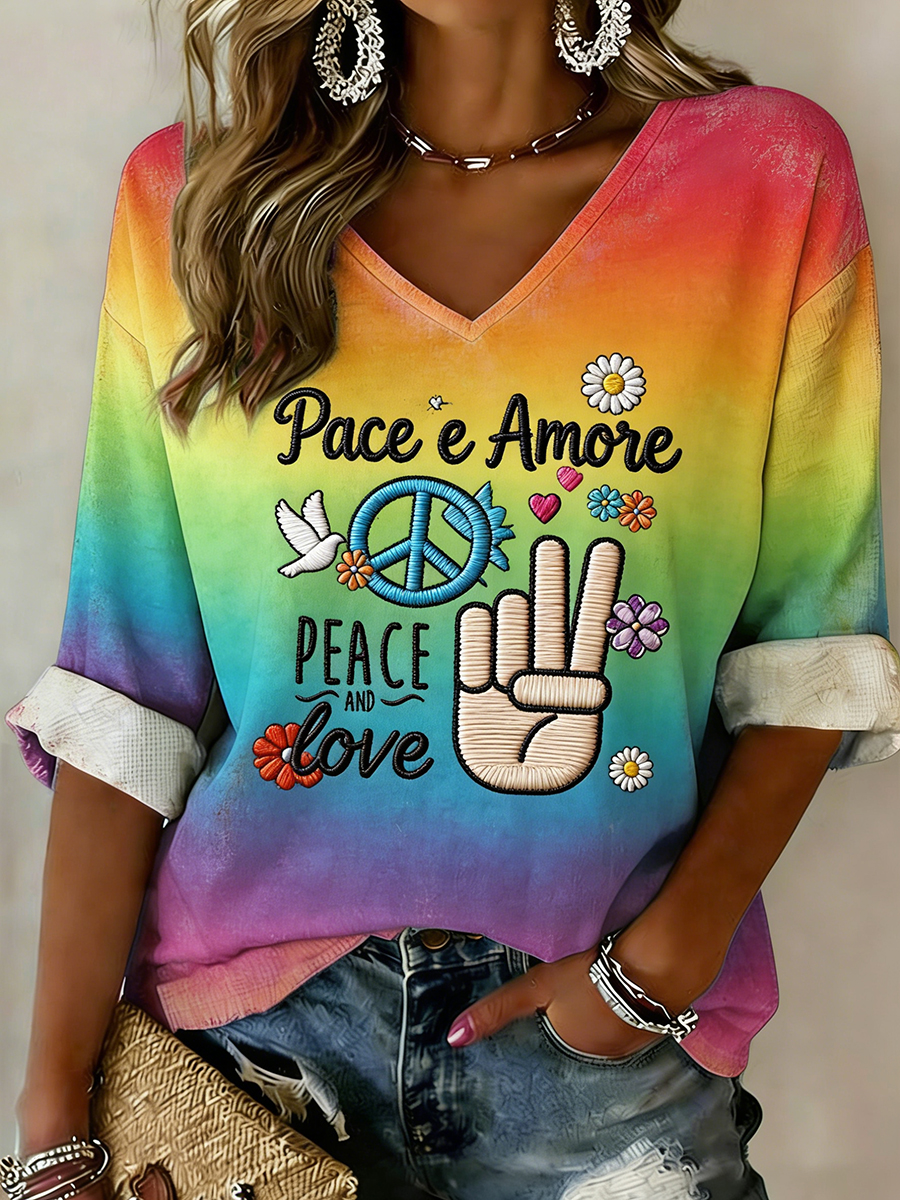Top da donna con stampa a tema pacifista e scollo a V