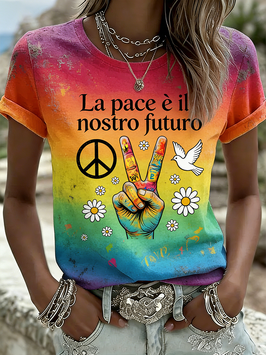 T-shirt da donna con grafica a sostegno della pace, girocollo
