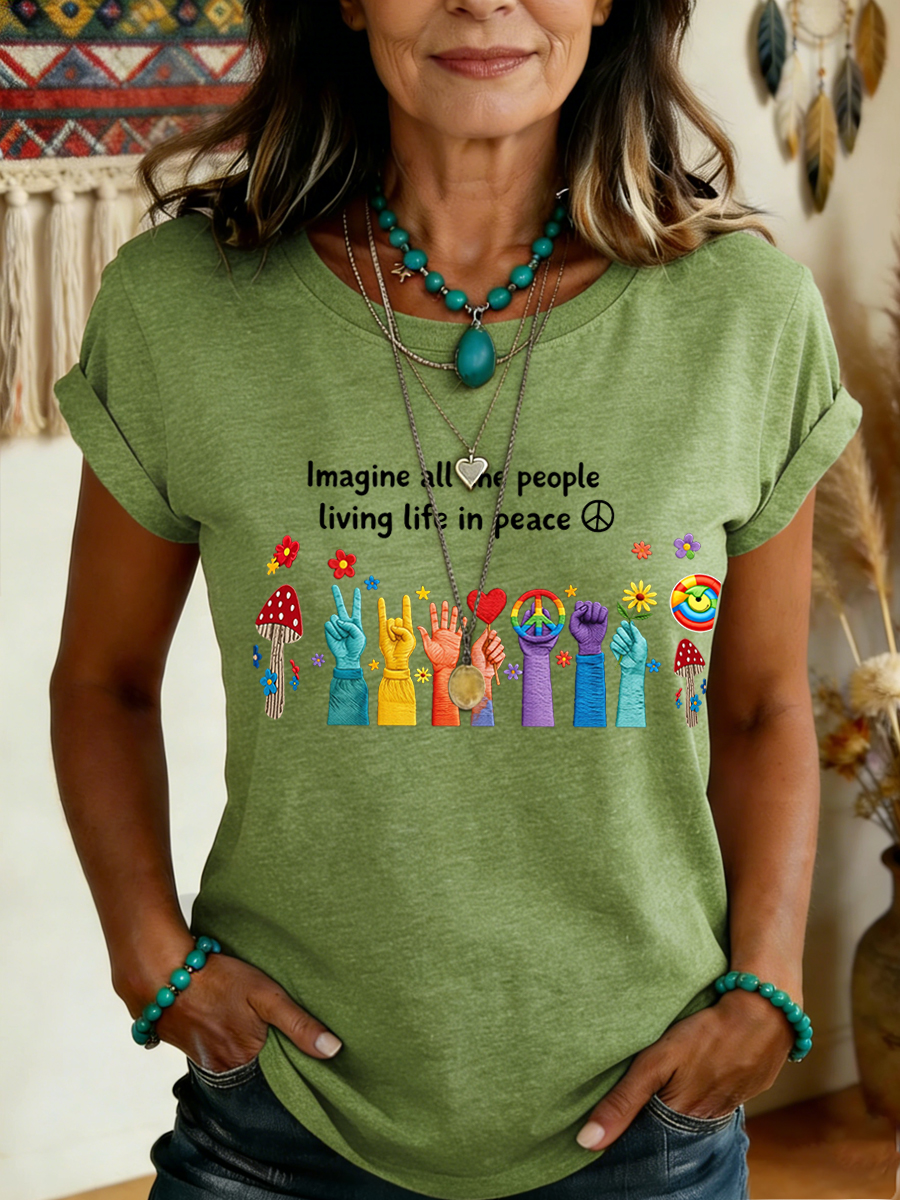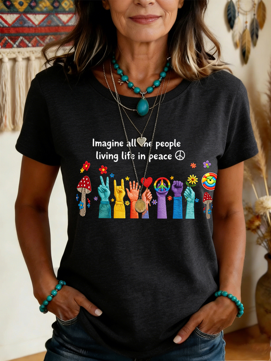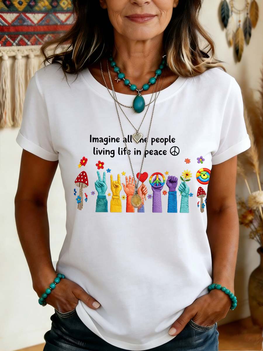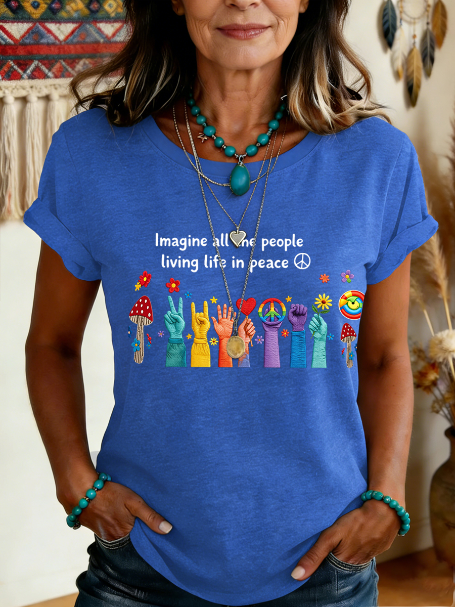 T-shirt casual con stampa "Immagina tutte le persone che vivono in pace" da donna