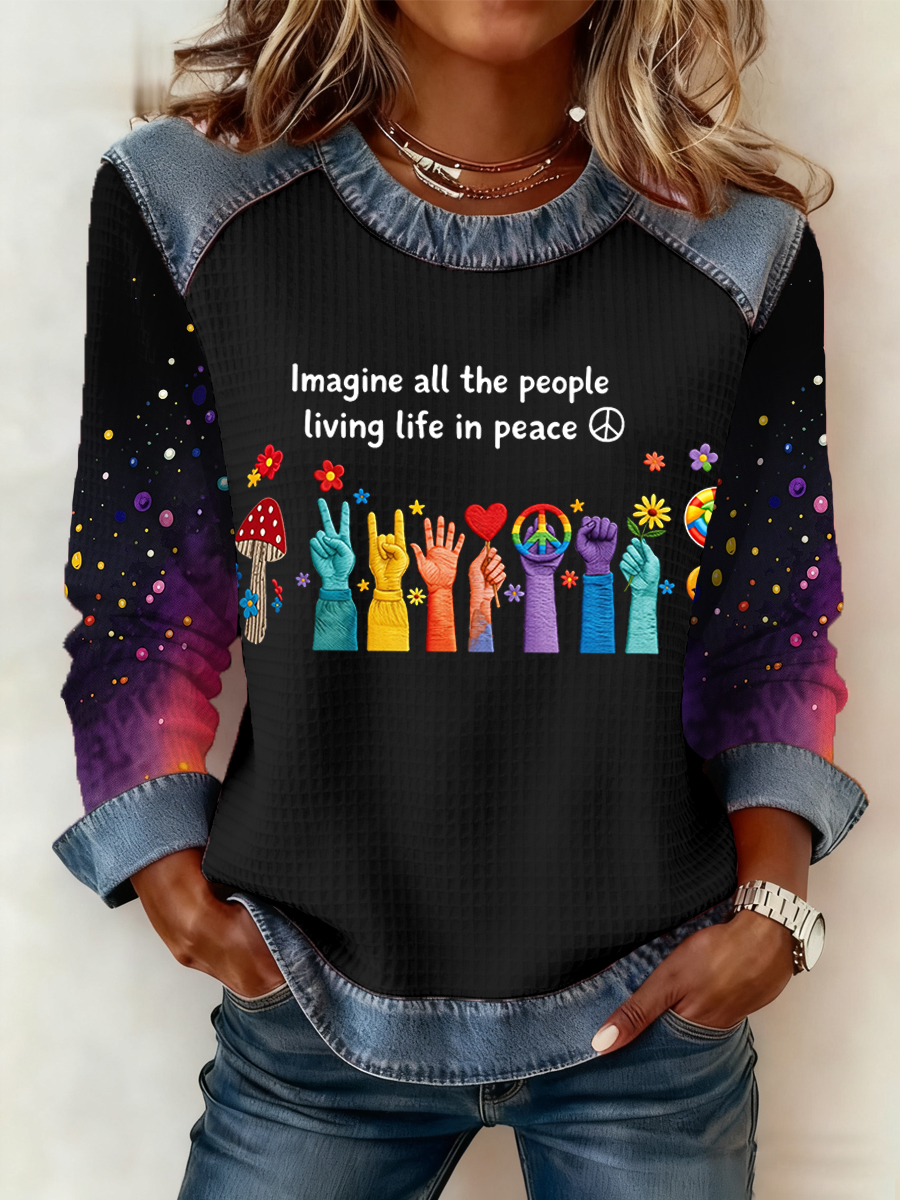 Top in denim patchwork con stampa "Imagine All The People Living Life In Peace" da donna